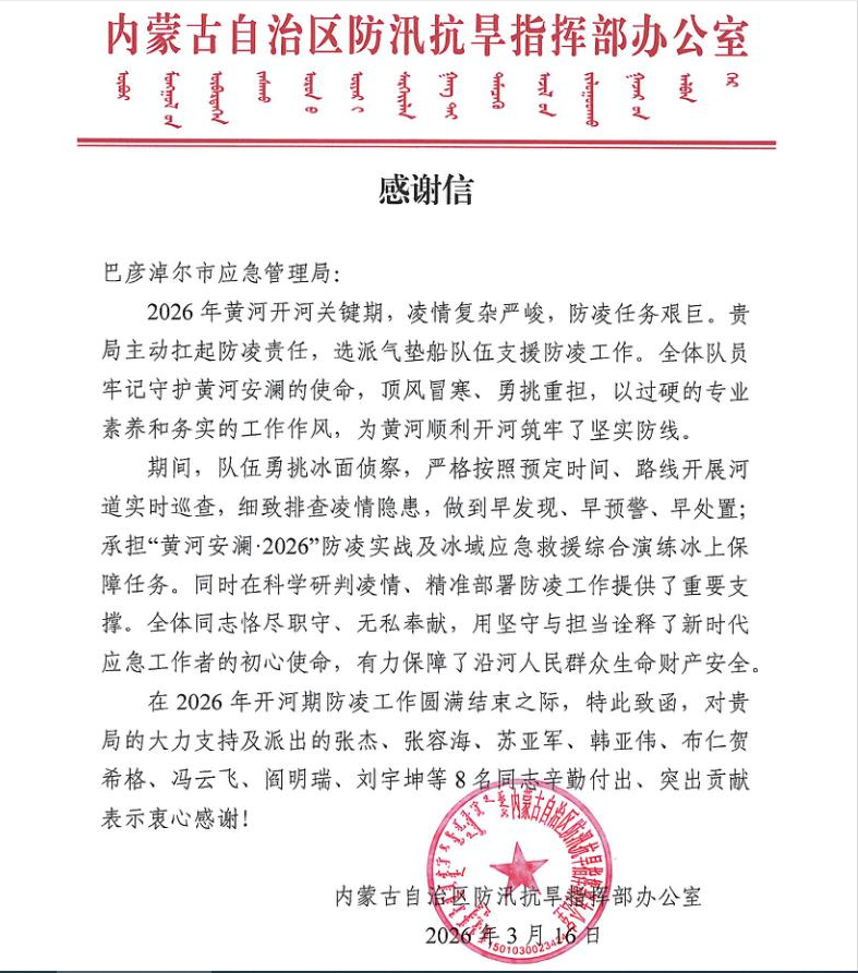 近日,内蒙古自治区防汛抗旱指挥部办公室向巴彦淖尔市应急管理局发来感谢信,对我局在2026年黄河开河关键期防凌工作中的突出表现予以高度肯定与感谢。