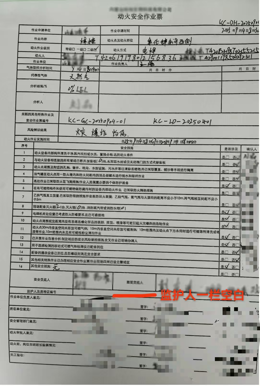 抽查特殊作业票(2025年9月4日动火作业,编号:KC-DH-20250904-01),涉及承包商作业的动火作业未实行双人监护制(本公司厂区作业,未执行本公司的作业管理制度及作业票;监护人一栏为空白)。不符合《安全生产“六特六专”工作举措》(巴安委办发〔2025]5号)附件第六条要求。